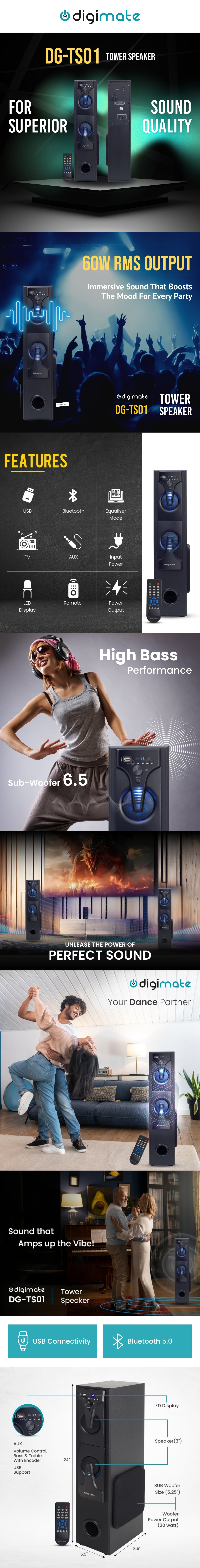 The Digimate DG-TS01 Bluetooth Tower Speaker offers an immersive audio experience with its powerful sound output and versatile features. Its sleek design, enhanced by LED lights and a display, complements any modern home entertainment setup.
